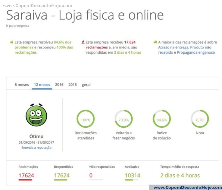 Confira o que diz e como está a reputação da loja Saraiva no ReclameAqui! Lembrando que mesmo uma loja tendo uma nota razoável, não significa que aquela loja seja ruím de comprar ou negociar, pois estas lojas possuem um grande volume de visitantes diáriamente em suas lojas e realizam muitas vendas. Logo na maioria das vezes, quem compra e fica satisfeito com sua compra, acaba não indo e deixando um depoimento favorável sobre está loja. Agora caso tenha algo incorreto ou alguma divergência em sua compra, neste caso, sim, é muito comum as reclamações serem postadas e públicadas. Fazendo com que a primeira impressão que temos de uma loja é que ela tem muitas reclamações. Mas lembre-se que estes números são bem pequenos se consideramos a quantidade de pessoas que ficaram satisfeitas e não reportaram suas experiências. #ficadica do CDH :)